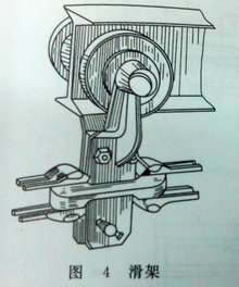 沿着架空轨道运行,或者用来支持链条质量,以免链条生产过大的挠度,前一种称为载重滑架,后一种称为空载滑架。滑架的滚轮都制成整体轴承式的,有闭式和开式两种,当悬挂输送机要通过高温烘干室时,一般都会采用开式滚轮,双铰接链的滑架一般与链条一起制成。
